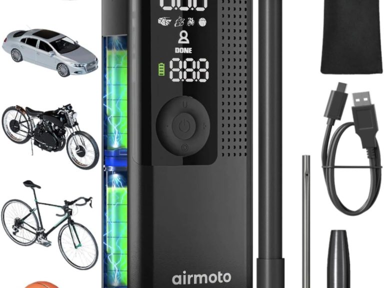 Airmoto Tire Inflator Portable Air Compressor - Air Pump For Car Tires with Digital Pressure Gauge, LED Light and Auto Shut-Off Function - Cordless Pump for Car, Motorcycle, Bicycle, Ball